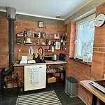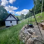 Die Villa Domek Za Lipa ist mit einem Wasserkocher, einem Kühlschrank und einem Herd für die Selbstversorgung in einen Essbereich im Freien ausgestattet.